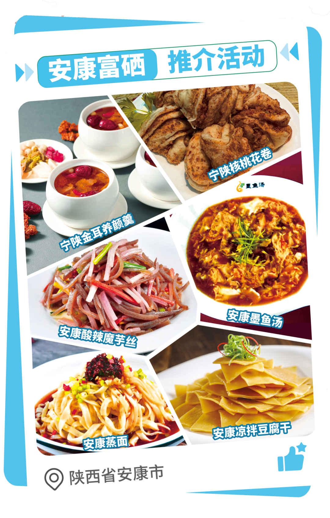 十一年前 南水北调中线工程通水 汉江之水跨越千里 为京津冀豫送去甘甜 作为“南水”供应的主力 安康不仅守护了一江清澈 更将这片土地的丰饶与深情 化作成舌尖上的美味 从陕南秘境到首都餐桌 一泓清水滋养的 安康硒味 你想尝尝吗? Let's go 安康富硒美食图鉴 每一口都是山水精华 “肥嫩壮实、色泽翠绿、栗香浓郁、醇厚回甜”的安康富硒茶,叶脉间流淌着汉江云雾的灵气,一杯清茶入喉,硒元素悄然滋养,清香甘醇,是山水安康最悠长的回甘。 生态富硒,好水好鱼!安康汉水鱼来自安康渔场生长在绿色无污染的环境,安康的好水塑造了优良的水产品品质,以其肉质细嫩,味道鲜美、口感爽滑和天然富硒优良品质,得到一致好评。 山林间的富硒香菇、木耳、花椒、土豆等,炖汤鲜掉眉毛,清炒脆嫩爽口,是大山深处不可多得的“硒”有风味。 安康富硒魔芋享誉全国,安康是全国四大魔芋优势种植区之一,魔芋种植面积超90万亩、年产量100万吨,有“世界魔芋看中国、富硒魔芋数安康”的美誉。 安康富硒猪肉生态健康,生猪年饲养量330万头、出栏200万头,安康阳晨牧业被农业农村部认定为“国家生猪核心育种场”,规模养殖和科技水平全省第一。 物以“硒”为贵 孕育新“硒”望 6月16至20日 “寻味832”之安康富硒美食周活动 将走进 中国政法大学 中央民族大学 北京师范大学 在充满青春活力的校园里 为师生们 带来一场舌尖上的陕南盛宴 舌尖上的安康 是自然的厚礼 更是守护的承诺 送出一江清水 留下生态福利 安康富硒好味 这口来自秦巴山汉水间的鲜香 等你来品尝~ 安康是南水北调中线工程重要水源涵养区,提供了丹江口水库63%的来水量,受水地群众喝的每10杯水中,有6杯来自安康。经科学普查,安康54.2%的土壤硒含量达到中硒以上水平,天然富硒土壤面积之大、地层之厚、硒储量之多,是全国乃至全世界之最,且硒浓度适中、易于植物吸收,被专家评价为“优质、环保、安全”的富硒区域。