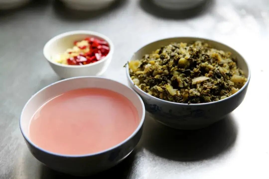 在吃鱼的时候,将腌制好的片鱼放入锅中,配以秘制辣椒酱、豆腐、方便面等,在“咕嘟咕嘟”的声响中,鱼肉的孔隙充分吸收了各种佐料的香气,质感嫩滑,松香爽口,麻辣味足,加上当地酸菜,更觉回味无穷。