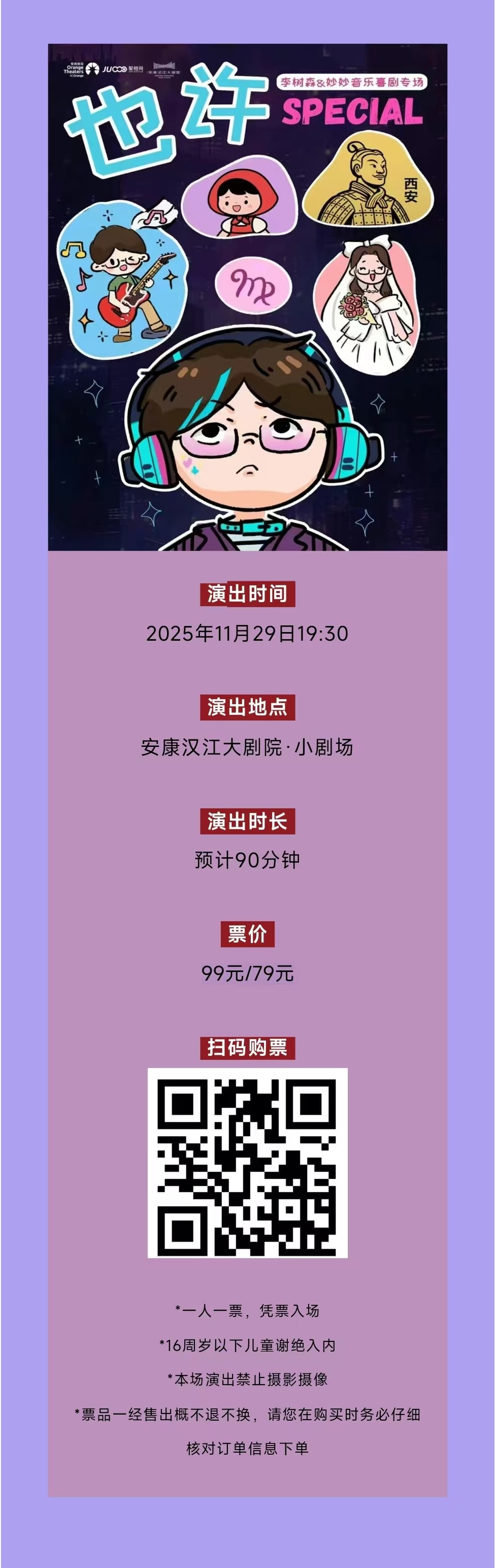 音乐喜剧 安康专场 安康本土音乐人 跨界喜剧舞台 携爱侣演绎《也许》 为家乡文旅发声! 李树森,土生土长的安康人。曾是乐队主唱,如今已抱着吉他在喜剧舞台上深耕两年,用旋律与欢笑续写人生新篇。 11月29日本周六19点30,将与其搭档妙妙在安康汉江大剧院带来个人脱口秀专场《也许》。 这两年李树森和妙妙在线下演出了千余场,专场也巡演了三十多个城市,收到全国各地好朋友的好评。 在创作中,他们扎根生活,争取每个作品都让大家喜闻乐见。把生活中的各种酸甜苦辣,都用喜剧的形式输出,以正能量传递给所有看演出的朋友们。 而这次,他决定回到他的家乡,安康。 这次演出李树森做了十足准备,特意将安康的山水风光、人文底蕴融入喜剧创作,想以更鲜活、更新颖的喜剧形式,让更多人看见安康的美,为家乡文旅宣传添一份力,为安康喜剧发展倾注一丝活力。