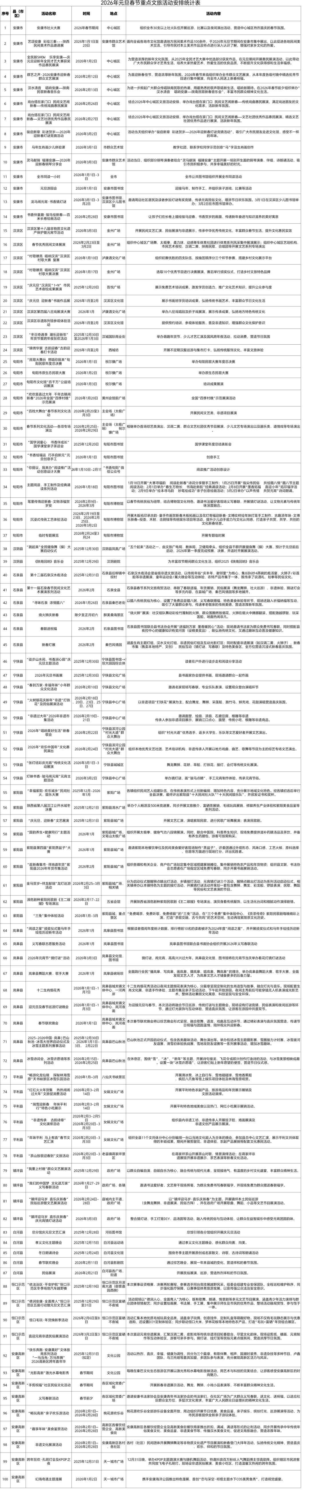 在中心城区重点街区、城市广场开展“群艺之声・春满安康”群众文艺汇演、“汉水清音・陕南民歌盛典”等活动,精选民歌、舞蹈、小品等优秀节目在人流量密集区域巡演;举办“全民新SHOW 乐享安康”全民才艺大赛获奖作品惠民展演,集中展示群众文艺创作成果。基层文化展示方面,以旬阳“欢欢喜喜过大年 千年古镇闹新春”2026年全国“四季村晚”示范展演为引领,“带动界牌村晚”“县河村晚”“明珠村晚”“社区春晚”等基层自办活动有序开展;汉滨区、平利县等县(市、区)同步举办基层文艺汇演,让群众成为文化活动主角。群众原创推广方面,举办“村歌嘹亮 唱响汉滨”村歌大赛复赛、决赛,平利县开展“茶山放歌迎春到”文旅活动,在茶山对歌、情景演绎,形成全民参与、全民共享的文化创作氛围。