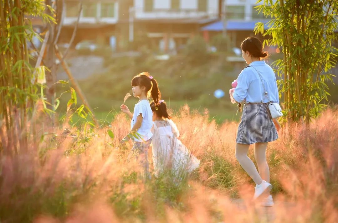 3.在粉黛草中拍摄,要充分利用好环境,体现出大片的粉色花海,所以可以从远景拍摄,也能利用三分法构图,在人物的视线前方留白,让整体画面更有呼吸感。